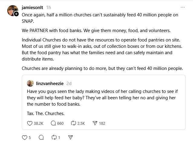 This post on Threads makes an excellent point. For decades, politically-conservative Christians have been arguing that the church and not the government should be taking care of the poor. To that I say, yes – the Church needs to step up. So far, it has been ineffective, and as a result the government had to step in. And that government assistance has been absolutely critical for many families.
